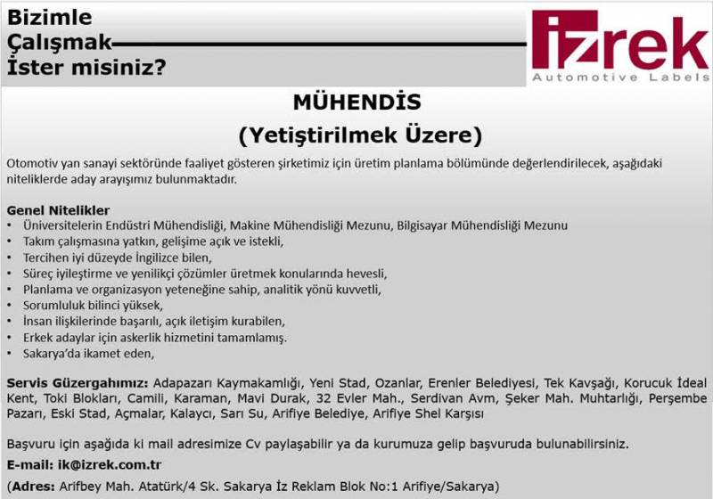 Sevgili mezunlarımız ve öğrencilerimiz, otomotiv yan sanayi sektöründe faaliyet gösteren İzrek Otomotiv üretim planlama bölümünde değerlendirilecek aday arayışındadır. Aranan nitelikler ektedir.