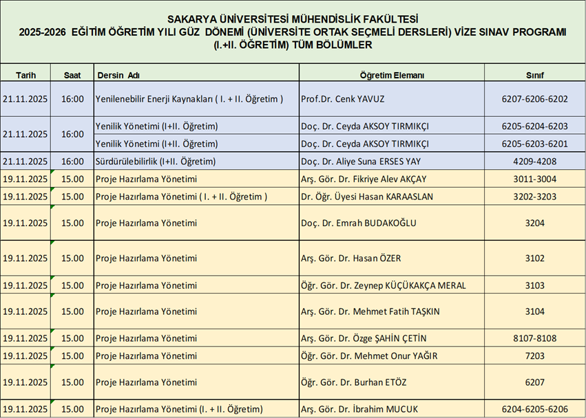 MÜHENDİSLİK FAKÜLTESİ 2025-2026 EĞİTİM ÖĞRETİM YILI GÜZ DÖNEMİ (ÜNİVERSİTE ORTAK SEÇMELİ DERSLERİ) VİZE SINAV PROGRAMI EKTE SUNULMUŞTUR.