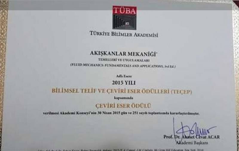 Çok sayıda başvurunun yapıldığı bildirilen programda mühendislik dalında sadece 9 çeviri eser ödüle layık görüldü. Bölümümüz Öğretim Üyesi ve Teknokent Genel Müdürü Prof. Dr. Tahsin Engin'in çeviri editörü olduğu ve ve Türkçe'ye 'Akışkanlar Mekaniği: Temelleri ve Uygulamaları' adıyla çevirisi yapılan kitap da ödül alan eserler arasında yer aldı.
