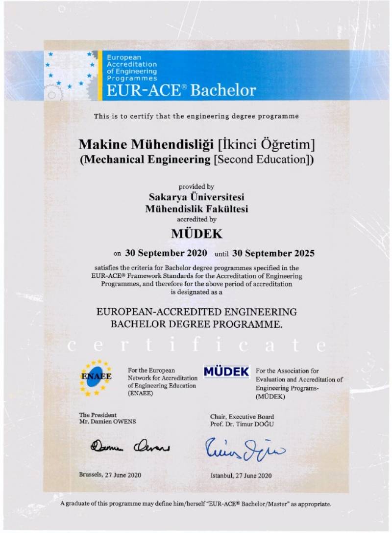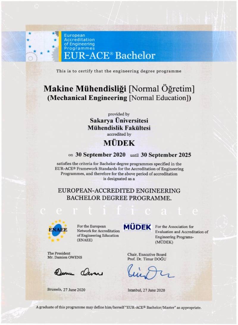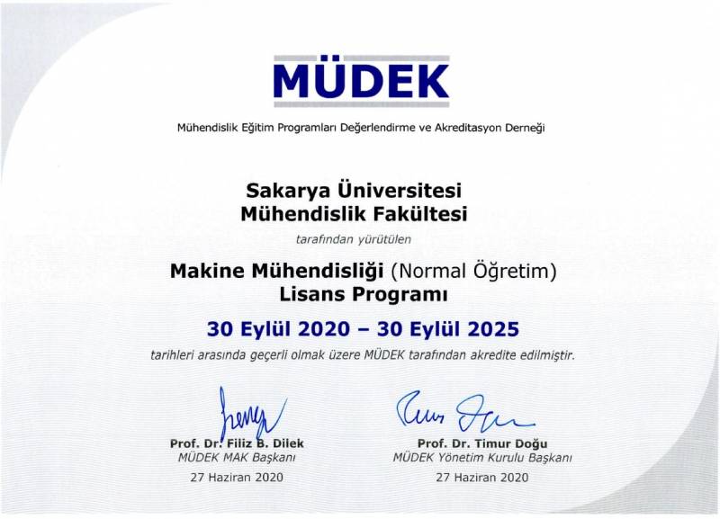 Sakarya Üniversitesi Mühendislik Fakültesi Makine Mühendisliği Bölümü Temmuz 2009 yılından bu yana MÜDEK Akreditasyonu çerçevesinde yapılan çalışmalarla program iyileştirmeleri sürekli devam etmektedir. En son Şubat 2020 yılında yapılan MÜDEK denetlemesinde tüm ölçütleri tekrar sağlayarak önümüzdeki 5 yıl süresince akredite olmuştur (http://www.mudek.org.tr/tr/akredit/akredite2020.shtm).