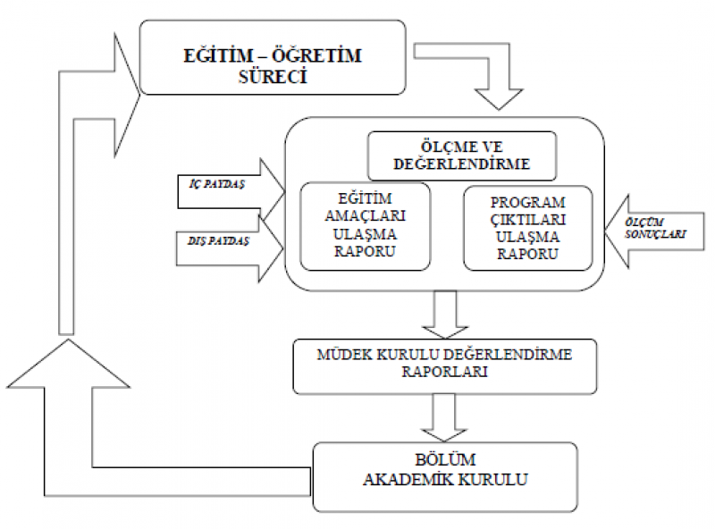 Programın gelişmeye açık alanları ile ilgili sürekli iyileştirme çalışmalarına yönelik olarak bölümde oluşturulan sistem aşağıdaki şematik döngüde gösterilmiştir. Sürekli iyileştirme amacıyla kurulan ölçme ve değerlendirme sistemi kapsamında iç ve dış paydaşlardan elde edilen veriler ve görüşler değerlendirilip ilgili komisyonlar tarafından raporlanmaktadır. Yapılan ölçme ve değerlendirme sonrasında elde edilen sonuçlar ışığında eğitim amaçları ve program çıktıları ile ilgili alanlar başta olmak üzere gelişmeye açık alanlar bölüm akademik kurulunda incelenir, eğitim planı ve müfredat güncellenir. Yapılan değişiklikler sonrasında tekrar aynı çevrim devam eder.